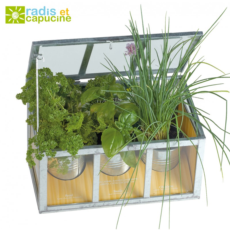 Comment profiter de vos aromates chez vous ? Cette jolie serre en zinc et en verre décorera d'une part votre intérieur et vous permettra également de faire pousser votre basilic, persil et ciboulette bio. Un kit complet, à offrir ou à s'offrir !