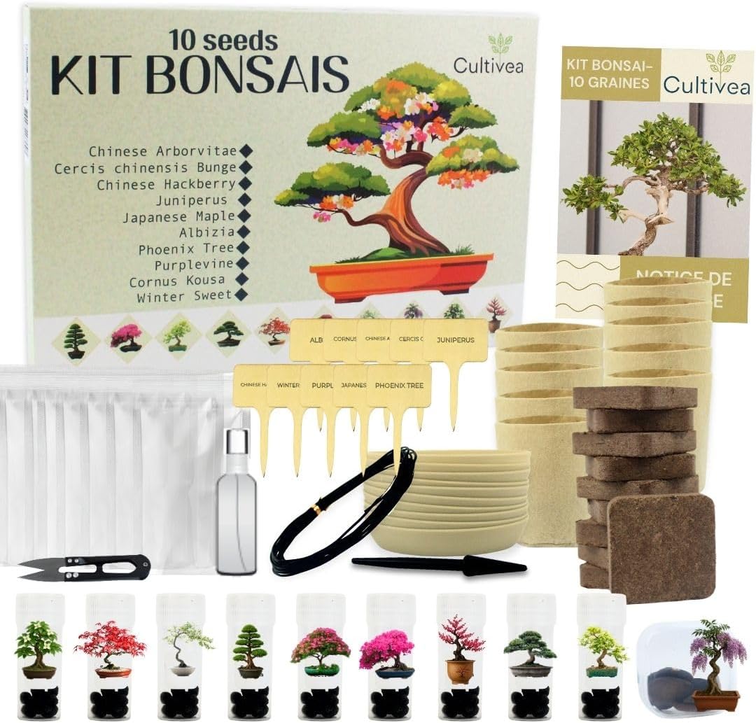 - Offrez-vous un moment de sérénité et de créativité avec le Kit Bonsaï Cultivea – 10 variétés rares à faire pousser chez vous, même sans jardin. Ce coffret complet a été conçu pour transformer l’art du bonsaï en une expérience accessible, apaisante et décorative. Parfait pour les débutants comme pour les passionnés, il vous guide pas à pas dans la culture de véritables arbres miniatures.