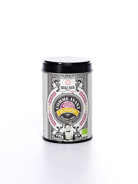 Présenté dans une jolie boîte en métal au style vintage comme celles qui ornaient les étagères de nos grands-mères, le cacao du goûter de Quai Sud évoque des souvenirs délicieux, mais avec des valeurs bien actuelles. Comme tous nos cacaos, il est produit dans nos plantations partenaires selon les principes de l’agriculture biologique, dans le respect des femmes et des hommes qui le cultivent. Le sucre de canne qui l’enrichit est lui aussi bio. Ainsi, à chaque tasse de chocolat chaud, à chaque gâteau préparé avec ce cacao, vous profitez du meilleur de la nature. C’est bon pour vous et votre famille, comme pour la planète .
