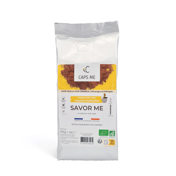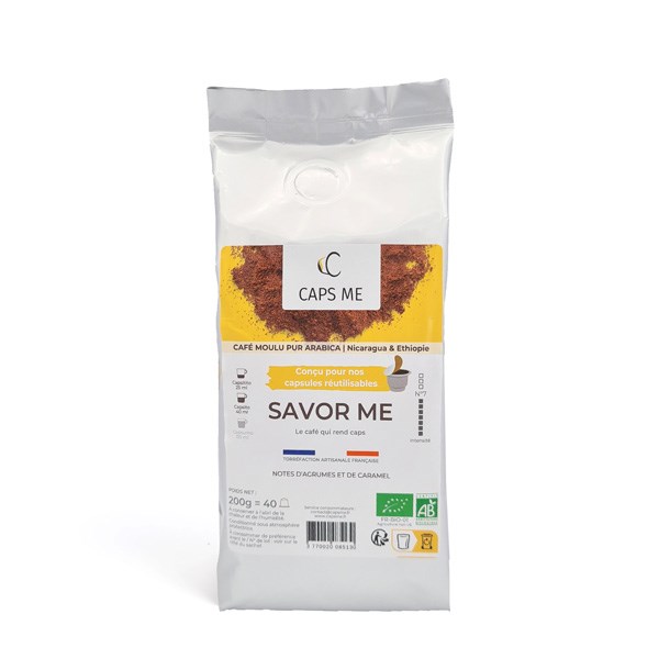 - Ce café moulu « Savor me » est issu de l'agriculture biologique. Les grains proviennent du Nicaragua et d'Ethiopie, deux terroirs reconnus par les amateurs de café d'exception.