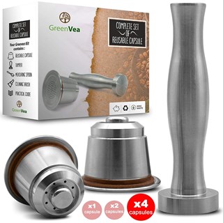 Le Kit GreenVea se compose de 4 capsules réutilisables ainsi qu’un tamper solide en inox, un guide pratique pour ne rien laisser au hasard, une cuillère doseuse ainsi qu’une petite brosse nettoyante. Le café peut avoir un goût plus léger, n'hésitez pas à opter pour un café plus intense.