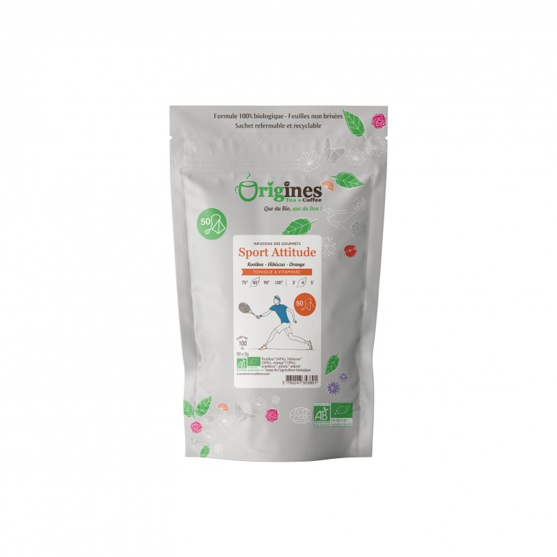 Sport Attitude est un mélange de Rooïbos, fleurs d'hibiscus, oranges et cranberries bio. Véritable concentré de bienfaits , cette infusion bio est idéale avant, pendant et après une activité sportive.