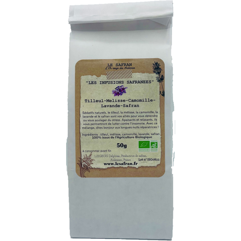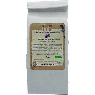 Les infusions safranées : Tilleul-Camomille-Mélisse-Lavande-Safran, 50g - Certifié par Ecocert France SAS FR-BIO-01. Agriculture UE non UE