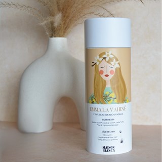 Cette infusion réconfortante, vous transporte sur un nuage de douceur vanillé. avec l'égérie de la saveur du packaging, EMMA LA VAHINÉ.