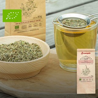 <p>Feuilles de Basilic Sacré Tulsi issues de l'agriculture biologique AB, idéales pour la préparation de tisane.<p><p>Le Basilic Sacré Tulsi, à port très ramifié, produit des feuilles vertes aux bords dentelés et offre un parfum et une saveur très prononcés.<p><p>PROPRIÉTÉS : Le Basilic Sacré Tulsi offre des vertus fortifiante, revitalisante, tonique physique et intellectuelle et immunostimulante.<p><p>PRÉPARATION : Pour réaliser une infusion, placer 3 grammes de plantes sèches par tasse et laisser infuser 5 minutes à couvert. Afin de pouvoir bénéficier des bienfaits de la plante, il est recommandé de boire 2 à 3 tasses par jour.<p><p>PRÉCAUTIONS : Ne pas utiliser chez la femme enceinte ou allaitante. Le Basilic Sacré Tulsi peut avoir un effet secondaire sur la glycémie. Il n'est pas recommandé chez les personnes prenant de l'insuline ou un autre traitement contre le diabète.<p>