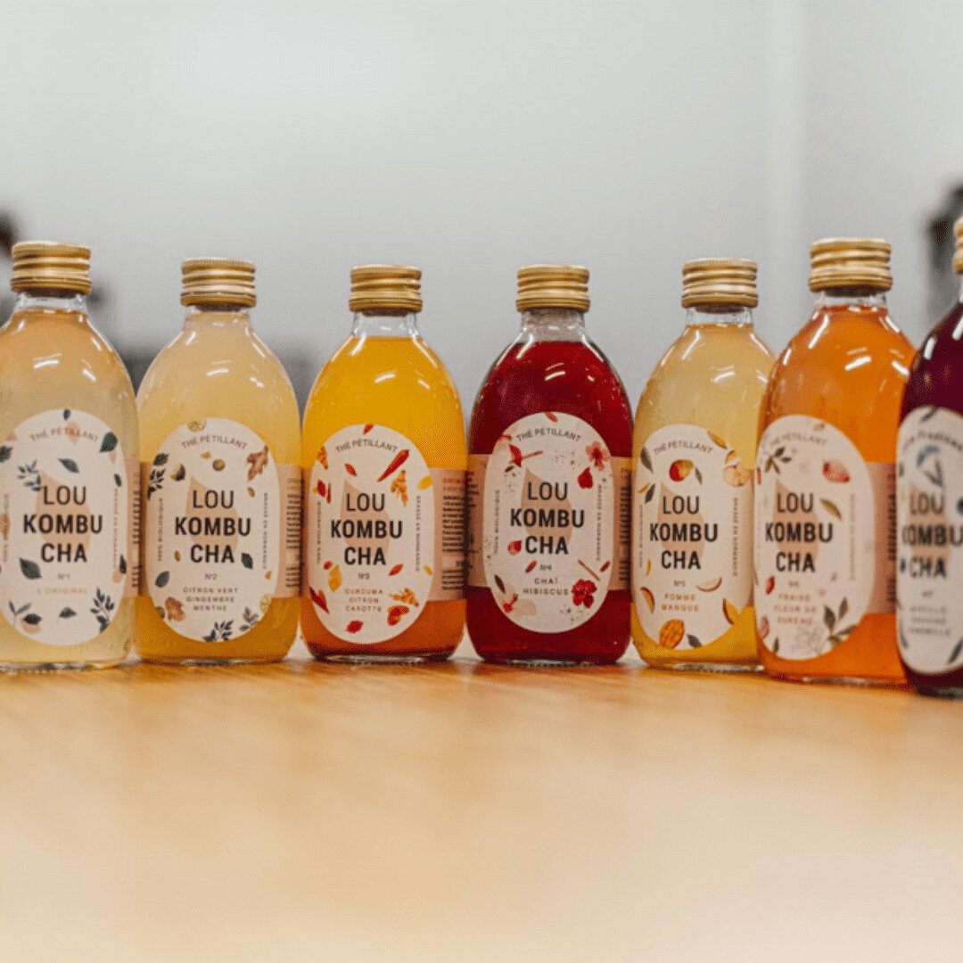 eau filtrée + thé vert sencha* + sucre de canne blond* (transformé durant la fermentation) + culture de kombucha* (bactéries et levures)],jus d’ananas*, fruit de la passion* jus de citron vert, myrtille*, lavande*, camomille*, verveine* fraises* + fleur de sureau*, jus de pomme*, jus de mangue* jus de carotte*, jus de citron*, jus de curcuma*, menthe marocaine*, thé noir keemun op*, cardamome*, poivre noir*, badiane*, clous de girofle*, cannelle de Ceylan*, gingembre*,Hibiscus