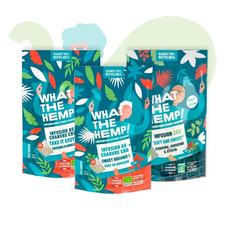 - l'>infusion Chill Out , >thé à la menthe revisité à la mode chanvre (sans théine ni caféine). L'association du chanvre et de 3 menthes est une merveille, le chanvre se substituant parfaitement aux tanins du thé, la >menthe apportant une touche de fraîcheur bienvenue. >Idéale après le repas grâce aux vertus digestives de la menthe ! Et le plus de cette infusion : 80% de chanvre !