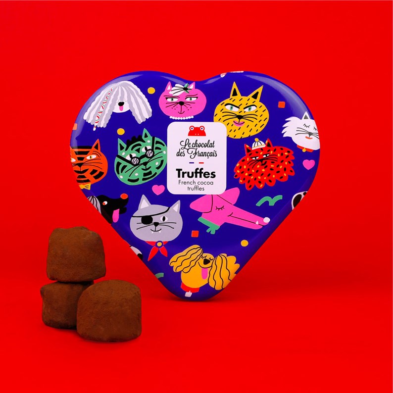 Cette mini boîte métallique en forme de cœur contient 5 délicieuses truffes au chocolat noir. Ultra fondantes, Bio et pur beurre de cacao, ces petites truffes sont un amour de cadeau. Fabriqué tout près d'Angers, exclusivement à partir d'ingrédients biologiques.