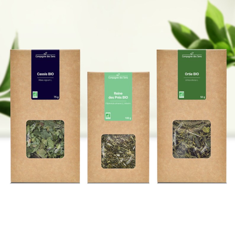Feuilles de Cassis BIO, feuilles d'Ortie BIO, sommités fleuries de Reine des Prés BIO