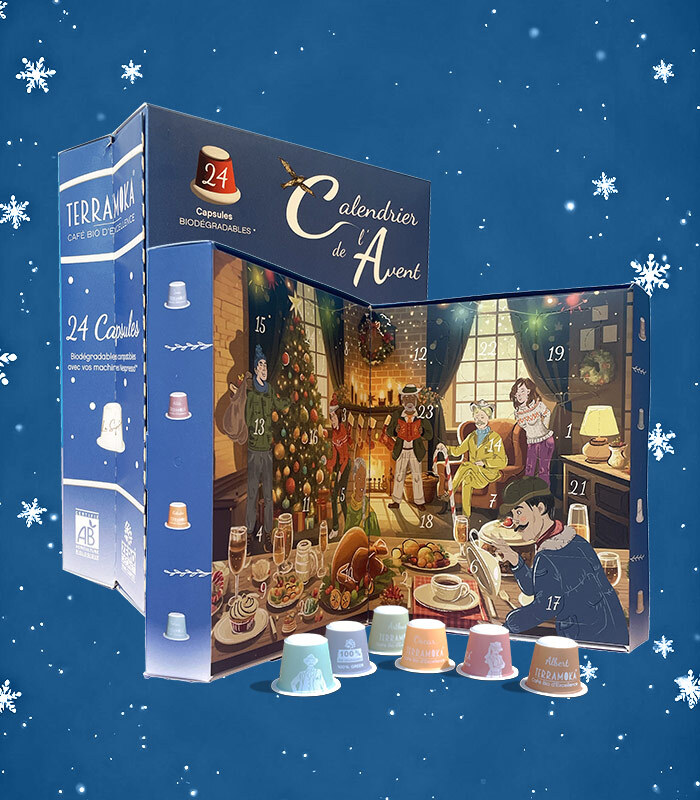 Faites vous plaisir avec notre calendrier de l'avent Terramoka et retrouvez nos 8 cafés bio grands crus dans 24 capsules biodégradables compatibles cafetières Nespresso®. Une très bonne idée cadeau pour les amateurs de bon café !