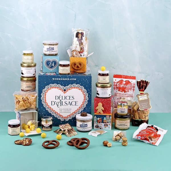 Avec son joli décor inspiré des marchés de Noël d'Alsace , le calendrier de l'Avent Délices d'Alsace vous invite à un voyage gustatif au cœur des traditions alsaciennes.