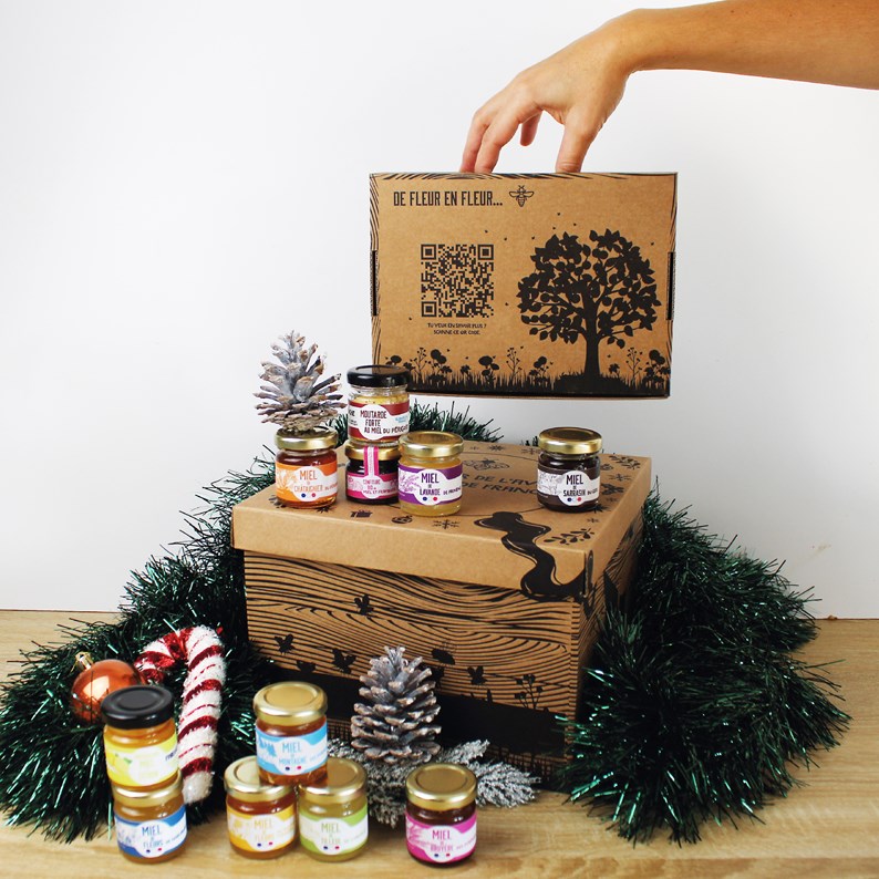 Spoiler alert : ce Calendrier de l'Avent Immersif comprend : un miel d'acacia* de Fontainebleau, un miel de châtaignier* du Périgord, un miel de Sarrasin* du Gers, un miel de Montagne* des Pyrénées, un miellat de Maquis de l'Ile de Beauté, un miel de Fleurs de Normandie, un miel de Fleurs du Bocage vendéen, un miel de Lavande* de Provence, un miel de Tilleul* de Chantilly, un miel de Bruyère des Pyrénées, 2 caramiels au miel du Périgord et au beurre salé, 2 miellinettes pâte à tartiner au miel et à la noisette du Périgord, une moutarde à l'ancienne au miel du Périgord, une moutarde forte au miel de Périgord, 2 pots de préparation miel et citron, 2 confitures bio au miel et Framboise, 2 confitures bio au miel et Abricot, un pot de pollen, un pot de préparation miel et truffe.