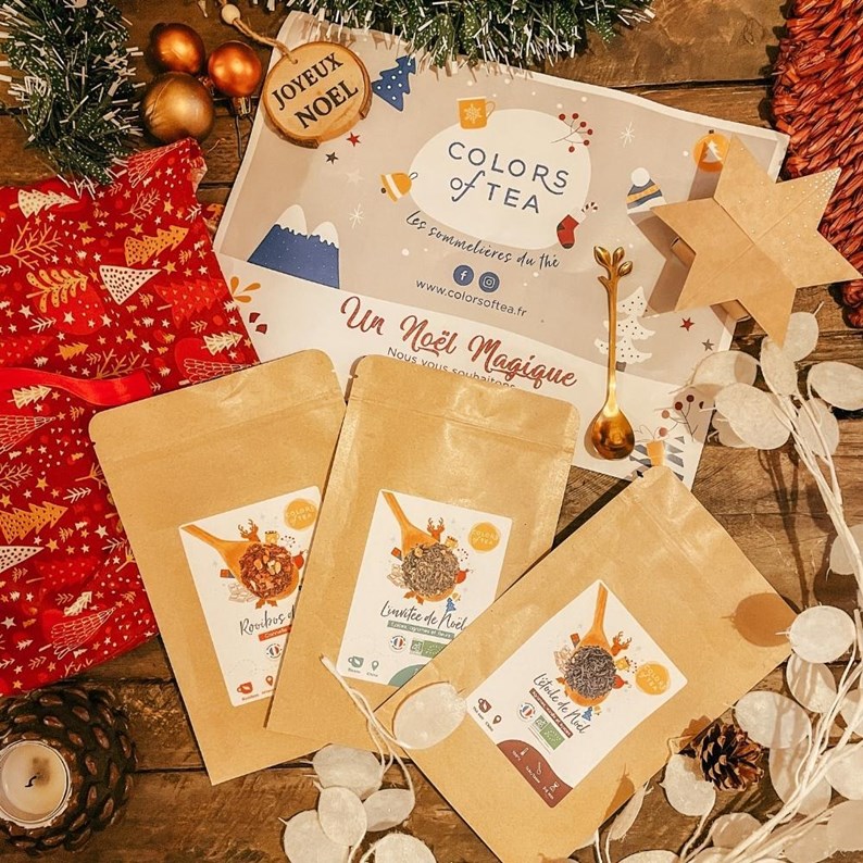 Thé de Noël BIO : Thé noir Assam*, — Inde du Sud*, écorces d’orange*, pomme*, bâtons de cannelle*, arôme naturel, pétales de rose*, cardamome*. Invitée de Noël BIO : Thé vert de Chine*, cannelle*, gingembre*, cardamome*, huile essentielles (orange*, citron*), honeybush*, écorces de citron*, fleurs hibiscus*, dés de pomme*, clous de girofle* Rooibos de Noël BIO : Rooibos naturel*, pomme*, arôme naturel, écorces d’orange*, bâtons de cannelle*, clous de girofle*, pétales de rose*, cardamome*