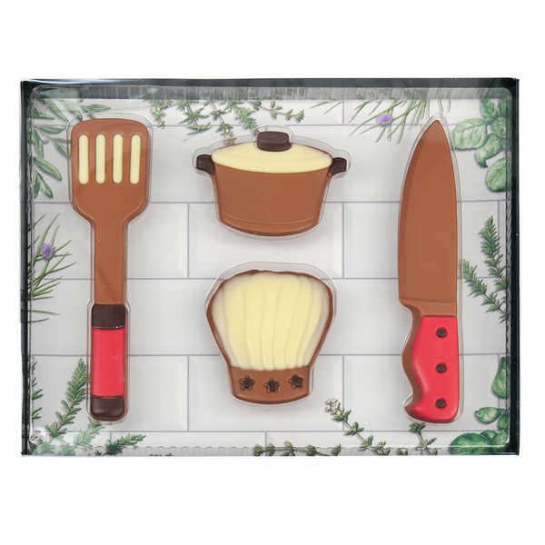 Le coffret propose une sélection de chocolats en forme d'ustensiles de cuisine : un couteau, une spatule, une cocotte et une toque, parfaits pour les amoureux de cuisine.