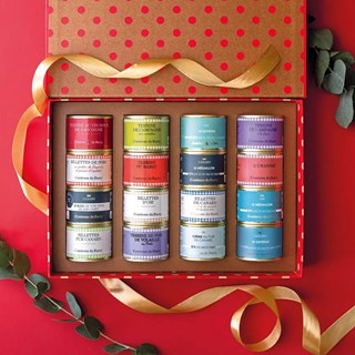 Rillettes pur canard supérieures, 70g : Viande de canard 50%, graisse de canard, eau, oignon, carotte, sel, poireau, céleri, poivre, ail, muscade, laurier, thym, girofle. Canard, Origine : France / Rillettes d'oie supérieures, 70g : Viande d’oie cuite 50 %, graisse d’oie, eau, viande de porc, sel, oignon, carotte, poireau, céleri, ail, muscade, poivre, laurier, thym, girofle. Oie et porc, Origine : France / Terrine au vin doux de Gascogne, 70g : Viande et gras de porc, viande et gras de canard, foie gras de canard 15 %, foie de poulet, vin blanc doux 6 %, œuf, oignon, sel, gélatine, poivre, baie de genièvre, muscade, sucre / Rillettes de porc au piment d’Espelette et jambon de Bayonne, 70g : Viande de porc 40 %, graisse de canard, eau, jambon de Bayonne 10 % (jambon de porc, sel, conservateur : nitrate de potassium), échalote confite à la graisse de canard, oignon, carotte, poireau, céleri, ail, sel de Guérande, piment d’Espelette 0,1%, poivre, muscade, thym, girofle, laurier / Terrine de campagne aux noisettes, 70 g : Maigre et gras de porc, foie de porc, œuf, noisette 1,9 %, sel, gélatine, sucre, poivre. Porc, Origine : France / Terrine du Barry 70g : Viande et gras de porc, foie de porc, œuf, carotte, sel, gélatine, persil, sucre, poivre, ail. Porc, Origine : France / Terrine de foie de volaille au Porto 70g : Gras de porc, foie de poulet 25,20 %, maigre de porc, œuf, Porto rouge 3,83 %, crème, sel, gélatine, persil, sucre, poivre, ail, fleur de muscade, laurier poudre. Porc et poulet, Origine : France / Bloc de foie gras de canard du Sud-Ouest 65g : Foie gras de canard du Sud-Ouest 88 %, eau, sel, poivre. Canard, Origine : France / Rillettes de canard au foie de canard, 70g : Viande de canard 35 %, graisse de canard, eau, foie gras de canard du Sud-Ouest* 20%, oignon, carotte, sel, poireau, céleri, poivre, ail, muscade, gingembre, girofle, cannelle, laurier, thym. Canard, Origine : France *Canard à foie ras du Sud-Ouest (Chalosse, Gascogne, Gers, Landes, Périgord, Quercy) / Crème au foie de canard, 65g : Foie gras de canard du Sud-Ouest 35 %, eau, crème, oeuf, foie de poulet, graisse de canard, poudre de lait entier (émulsifiant: lécithine de soja), Monbazillac, sel, amidon de blé, gélatine (porc), poivre, antioxydant (extrait de romarin), muscade, gingembre, girofle, cannelle. Canard et poulet, Origine: France / Suprême de foie de canard, 65g : Gorge de porc, viande de poule, bloc de foie gras de canard 20 % (foie gras de canard du Sud-Ouest, eau, sel, poivre), foie de volaille, gras de Porc, Monbazillac (sulfites) , œuf, eau, sel, gélatine, poivre.Porc, poule, canard et volaille, Origine : France. *Canard à foie gras du Sud-Ouest (Chalosse, Gascogne, Gers, Landes, Périgord, Quercy) / Médaillon de foie de canard, 65g : Bloc de foie gras de canard 50 % (foie gras de canard du Sud-Ouest, eau, sel, poivre), viande et gras de porc, viande de poule, foie de poulet, Monbazillac AOC, œuf, sel, gélatine, sucre, poivre. Canard, porc, poule et poulet, Origine : France / Suprême de foie d'oie, 65g : Viande et gras de porc, viande de poule, bloc de foie gras d’oie 20% (foie gras d’oie du Sud-Ouest, eau, sel, poivre), foie de poulet, Monbazillac AOC (sulfites), œuf, sel, gélatine, sucre, poivre. Porc, poule, oie et poulet, Origine : France / Médaillon de foie d’oie, 65g : Bloc de foie gras d’oie 50 % (foie gras d’oie du Sud-Ouest, eau, sel, poivre), viande et gras de porc, poule, foie de poulet, Monbazillac AOC, œuf, sel, gélatine, sucre poivre. Oie, porc, poule et poulet, Origine : France / L’Unanime (sans porc, ni alcool), 70g : Foie de volaille, oignons confits (oignons, graisse de canard, curcuma), magret de canard 20%, viande de volaille, pomme de terre, oeuf, graisse de canard, sel, gélatine (bovine) , fibre de pomme de terre, fibre d'agrumes, poivre, ail. Canard et volaille, Origine : France / Terrine de campagne à la figue, 70g : Gorge de porc 44%, foie de porc 28%, préparation à base de figue (figue 5%, sucre, pâte de figue 2,7%, correcteur d'acidité : acide citrique), maigre de porc 7%, œufs, sel, sucre, gélatine, poivre. Porc, Origine : France