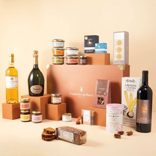 Ruinart Champagne Brut : Cépages : 40 % chardonnay, 57 % de pinot noir, 3 % de meunier. / Château Roumieu Sauternes : Cépages : Sémillon 89 %, Sauvignon Blanc 10 %, Muscadelle 1%. / Pomerol Les chemins de la Croix du Casse : Cépage Merlot, Cabernet Franc / Foie gras de canard entier IGP Sud-Ouest : Foie gras de canard IGP Sud-Ouest* 98 %, sel de Guérande 1,3 %, poivre. Canard, Origine : France *Canard à foie gras du Sud-Ouest (Chalosse, Gascogne, Gers, Landes, Périgord, Quercy) / Foie gras d’oie entier du Sud-Ouest : Foie gras d’oie Sud-Ouest, sel de Guérande 1,3 %, poivre. Oie Origine : France. / Crackers au pavot et poivre : Farine de blé, huile de colza, sel, poudres à lever : tartrates de potassium, carbonates de sodium, graines de pavot 2 %, poivre. Fabriqué dans un atelier qui utilise : oeuf, poudre de lait, fruit à coques. / Pain d’épices : Sirop de sucre inverti, farine de seigle (gluten), miel 24 %, œuf entier, farine de froment (gluten), jaune d’œuf, épice 0,6 % (cannelle, anis, poivre), poudre à lever (carbonate acide de sodium), sel. Fabriqué dans un atelier qui utilise du lait et des fruits à coques. / Chutney de figue au vinaigre balsamique : Figues 60 %, sucre de canne, vinaigre balsamique 9 % (vinaigre de vin, moût de raisin), épices. / Caviar d’aubergines : Aubergines 56 %, huile de tournesol, oignons, crème de sésame, ail, jus concentré de citron, huile d’olive vierge extra, sel, épices, antioxydant : extrait de romarin. / Tapenade verte aux amandes : Olive verte 79 %, huile d'olive vierge extra, amande 3,5 %, câpre, ail, crème d'anchois (anchois, huile de tournesol, vinaigre de vin aromatisé, sel), jus concentré de citron, sel. Peut contenir des éclats de noyaux. / Rillettes pur canard supérieures : Viande de canard 50 %, graisse de canard, eau, oignon, carotte, sel, poireau, céleri, poivre, ail, muscade, laurier, thym, girofle. Canard, Origine : France / Terrine pur canard à la fleur de sel et au piment d’Espelette : Viande et gras de canard 73 %, foie de canard 9%, oignons confits (oignon, graisse de canard, piment d'Espelette 0,03%), œuf, fleur de sel de Guérande 1,3 %, tapioca, piment d'Espelette 0,5 %. Canard, Origine : France / Terrine de canard aux olives : Gras et maigre de porc, viande de canard 30%, olives vertes confites 13% (olives vertes, eau, sel, acide citrique), foie de volaille, œuf, sel, poivre, thym, fenouil, laurier. Canard et porc, Origine : France / Rillettes de Saint-Jacques aux algues : Saint-Jacques (Chlamys opercularis, pêché en Ouest Ecosse, Manche et Mer Celtique) 50 %, crème, saumon, amidon transformé de pomme de terre, sel, poivre, épaississant extrait d’algues: carraghénanes, algues séchées 0,1 % / Terrine de canard à l’orange : Viande de canard 38 %, gorge de porc, foie de volaille, oignons confits (oignons, graisse de canard), œuf, liqueur à l’orange (alcool, eau, Cognac, arôme naturel d’oranges amères, colorant : E 150a), sel, zestes d'orange semoule 1,2 %, farine de blé, tapioca, gélatine, poivre, gingembre, muscade, girofle, cannelle. Porc, canard et poulet, Origine : France / Rillettes de canard au foie de canard : Viande de canard 35 %, graisse de canard, eau, foie gras de canard du Sud-Ouest* 20 %, oignon, carotte, sel, poireau, céleri, poivre, ail, muscade, gingembre, girofle, cannelle, laurier, thym. Canard, Origine : France *Canard à foie gras du Sud-Ouest (Chalosse, Gascogne, Gers, Landes, Périgord, Quercy) / Crème au foie de canard : Foie gras de canard IGP Sud-Ouest* 35 %, eau, crème liquide [crème (lait), stabilisants : carraghénanes], œuf, foie de volaille, graisse de canard, poudre de lait entier (émulsifiant : lécithine de soja), Monbazillac, sel, amidon de blé, gélatine, poivre, antioxydant (extrait de romarin), muscade, gingembre, girofle, cannelle. Canard et volaille, Origine : France * Canard à foie gras du Sud-Ouest (Chalosse, Gascogne, Gers, Landes, Périgord, Quercy) / Tapenade noire, tomates séchées et basilic : Olive noire 77 %, huile d'olive vierge extra, câpres, tomate séchée 4 %, câpre, ail, moutarde en grains (eau, graine de moutarde, vinaigre, sel), jus concentré de citron, crème d'anchois (anchois, huile de tournesol, vinaigre de vin aromatisé, sel), sel, aromates dont basilic 0,8 %. Peut contenir des éclats de noyaux. / Gressins à la truffe : Farine de blé dur (gluten), huile d'olive 8%, truffe d’été (tuber aestivum) 3%, levure, sel marin, arômes, farine de blé malté. Peut contenir des traces de sésame et de soja. / Amandes grillées au chocolat au lait : Chocolat au lait supérieur (sucre, beurre de cacao, masse de cacao, poudre de lait entier, émulsifiant : lécithine de soja, arôme naturel de vanille) 68 %, amandes grillées 30 %, poudre de cacao maigre, sucre. Traces éventuelles de gluten, sulfites et autres fruits à coques. / Assortiment de pâtes de fruits : sucre (Origine : France), pulpe de mirabelle de Lorraine (mirabelle (Origine : Lorraine), sucre, correcteur d'acidité : acide citrique, antioxydant : acide ascorbique) 83 %*, fraises Charlotte et Mara des bois 53 %* (Origine : France), cassis noir de Bourgogne 35 %* (Origine : France), compote de pomme (pomme, sucre), sirop de glucose, pulpe d'abricot (abricot, sucre), sucre inverti, gélifiant : pectine de pomme ou de citron vert, jus concentré de citron vert, arôme naturel de mirabelle, de fraise et de cassis. Enrobage : sucre. *Selon le code d’usage. / Assortiment de caramels : Sirop de glucose, sucre, lait concentré sucré, beurre 10 %, poudre de lait, pâte de cacao 1,67 %, amandes, noisettes grillées, noix du Périgord 0,33 %, sel des Salies de Béarn 0,8 %, fleur de sel de salies du Béarn 0,3 %