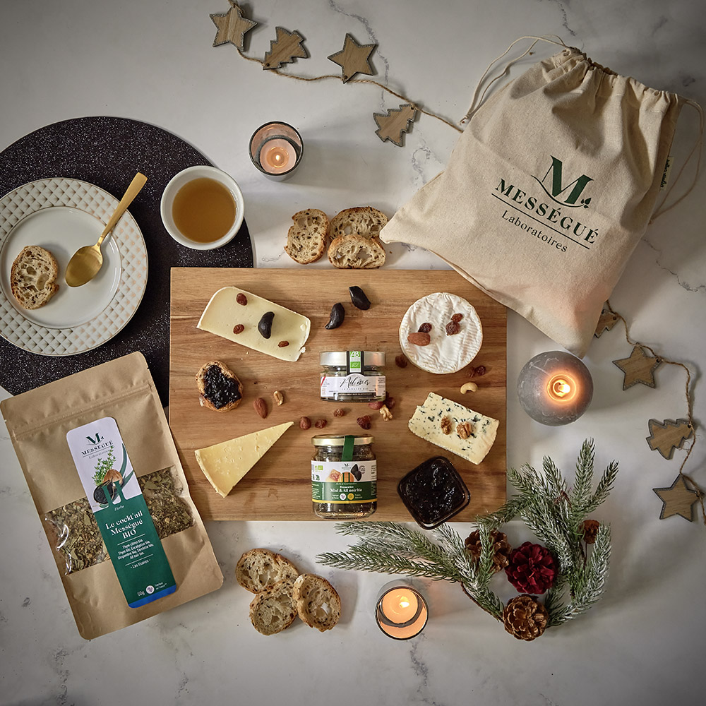1 x pochon en coton organique 25*30cm1 x gousses d'ail noir bio*1 x miel & ail noir bio*1 x tisane cockt'ail Mességué bio*