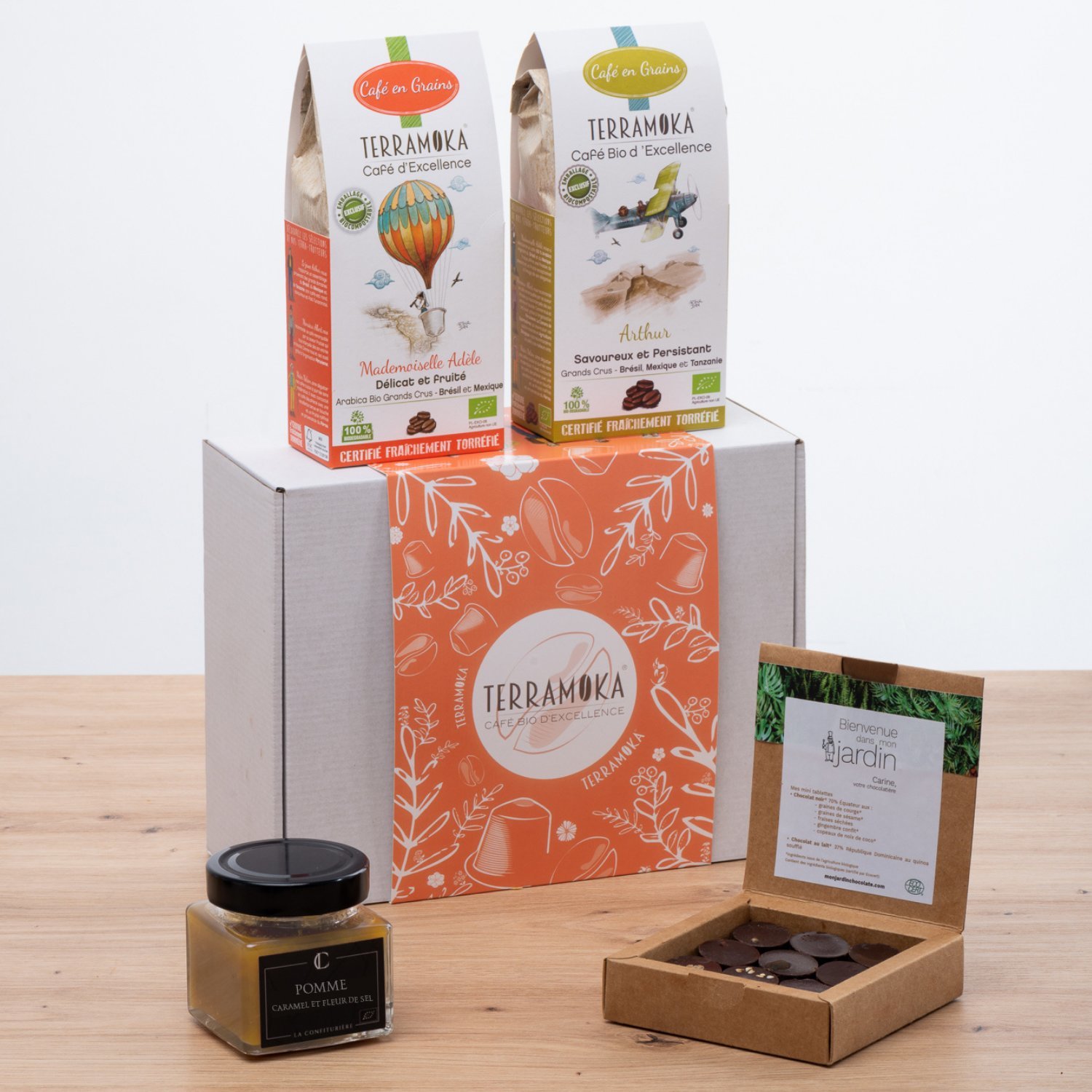 Adèle : 100% Arabica Brésil et Mexique, Arthur : 100% Brésil, Mexique et Tanzanie / Confiture : pommes, sucre de canne, beurre, crème fraiche, fleur de sel de guérande / Chocolat : Chocolat noir d'Equateur 70%, sucre non raffiné et sucre de canne non raffiné bio, chocolat au lait, miel bio, beurre, crème fraîche, fleur de sel, amandes, cacahuètes, graines de sésame, anis vert, noix de coco, graine de coriandre, graines de courge, gingembre frais, sirop de riz bio, pulpe de citron, de cassis, de fruit de la passion