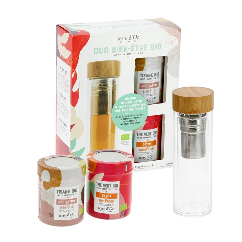 Thé vert aux huiles essentielles Détox : thé vert* (Chine) 60,8%, reine des prés*23%, curcuma* 8%, arôme naturel de bergamote*, cannelle*, huile essentielle de bergamote* 0,2% *Ingrédients issus de l'agriculture biologique Infusion huiles essentielles Méditation : Aubépine* 59,3%, feuille de mélisse* 16,5%, fleur d'immortelle* 15%, arôme naturel d'ylang-ylang*, arôme naturel de laurier*, huile essentielle d'ylang-ylang* 0,2% *Ingrédients issus de l'agriculture biologique