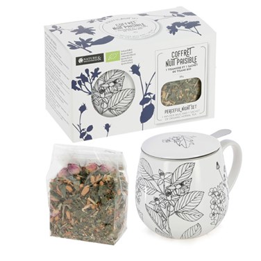 - La tisanière est accompagnée par un sachet de tisane bio savoureuse, aux vertus apaisantes. L'aubépine, l'oranger, la rose et la passiflore ont été spécialement sélectionnées pour leurs vertus. Elles sont propices à une nuit de sommeil paisible.