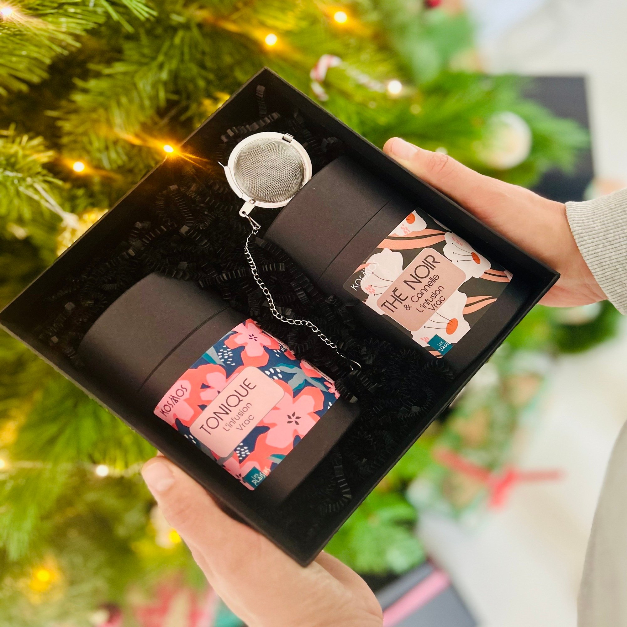 THÉ NOIR: THÉ NOIR DE CEYLAN, CANNELLE, BASILIC POURPRE, CALENDULA. TISANE TONIQUE: MENTHE POIVRÉE, ESTRAGON, THYM CITRON, ZEST DE CITRON ET GINGEMBRE