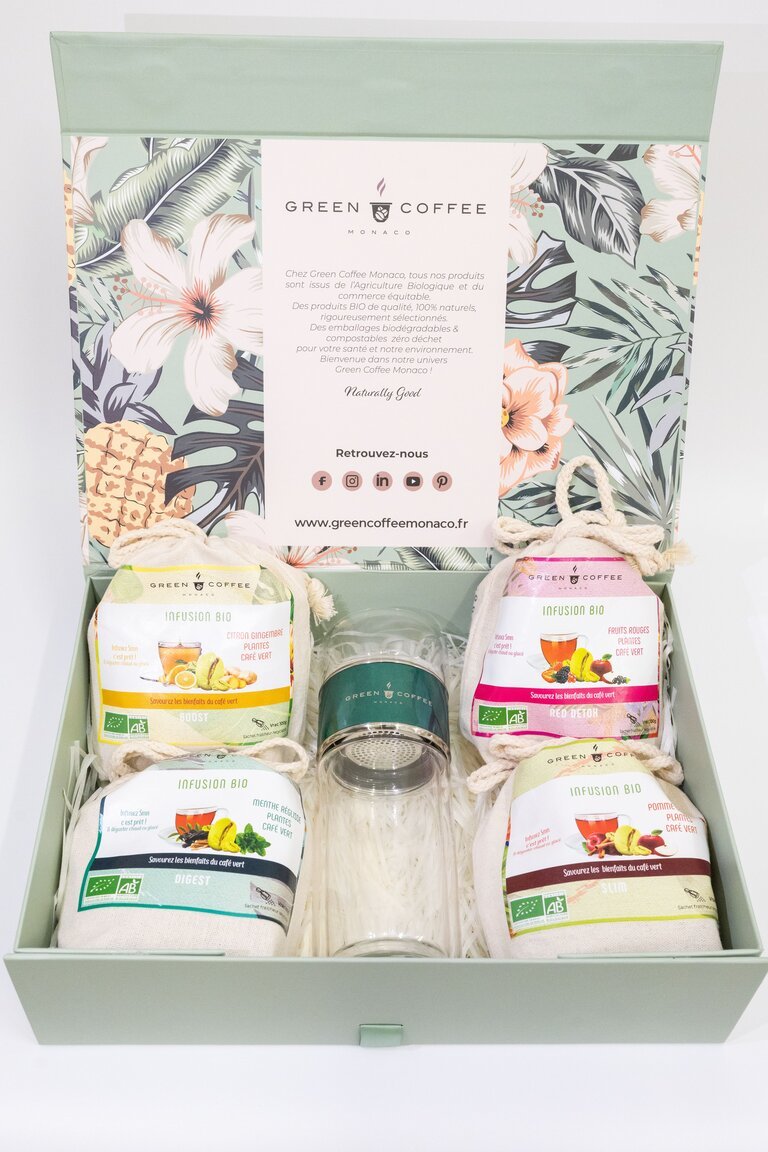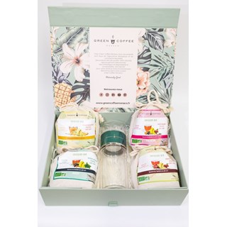 Une alliance nutritive divine élaborée pour les personnes désireuses de se remettre en forme et regagner du tonus. Le mythique café vert, idéal pour améliorer les performances sportives et les 4 saveurs de nos infusions :