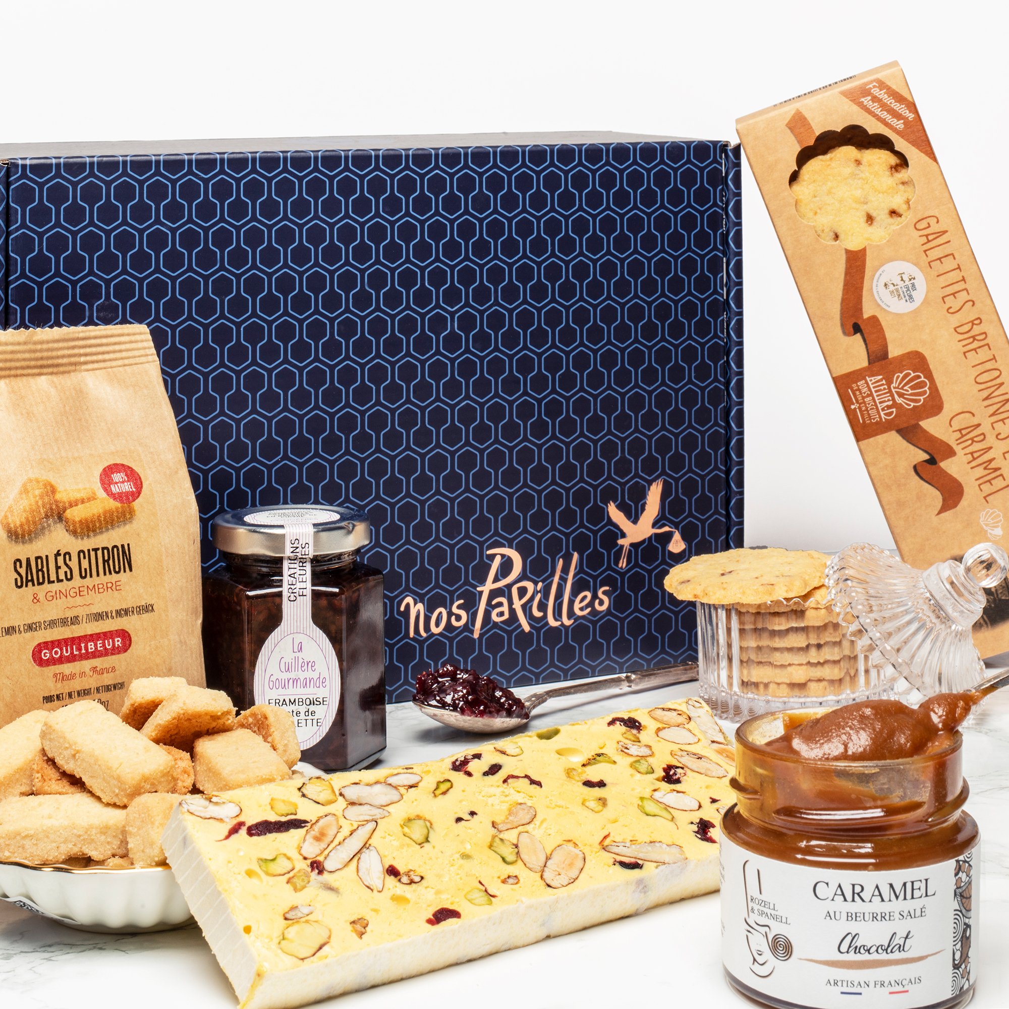 Confiture framboise, litchi, rose Caramel beurre salé au chocolat Barre de nougat safran, canneberge, pistachesSablés citron, gingembre Galettes éclats de caramels
