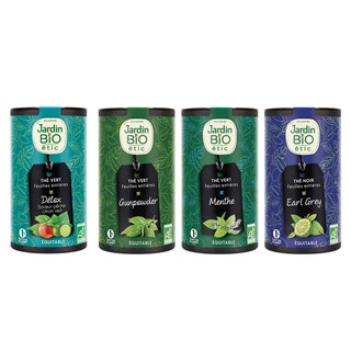 Ingrédients : THE VERT DETOX : thé vert* 51%, églantier*, hibiscus* 13%, arôme naturel de pêche* 7%, cassis feuille* 6%, extrait de citron vert*. *Produits issus de l'agriculture biologique. 64% du total des ingrédients d'origine agricole sont conformes aux standards du commerce équitable. THE VERT GUNPOWDER : thé vert Gunpowder* 100%. *Produit issu de l'agriculture biologique. 100% du total des ingrédients d'origine agricole sont conformes aux standards du commerce équitable. THE VERT MENTHE : thé vert* 81%, menthe poivrée* 15%, extrait de menthe*. *Produits issus de l'agriculture biologique. 96% du total des ingrédients d'origine agricole sont conformes aux standards du commerce équitable. THE NOIR EARL GREY : thé noir* 96%, extrait de bergamote* 4%. *Produits issus de l'agriculture biologique. 96% du total des ingrédients d'origine agricole sont conformes aux standards du commerce équitable.