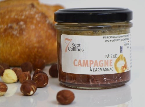 Viande de porc (échine, poitrine, gorge 71%) et foies de volaille (14%) origine France, vin blanc (SULFITES), NOISETTES (3,5%), eau, Armagnac (1,5%), sel de Guérande, ail, poivre, agar-agar, genièvre
