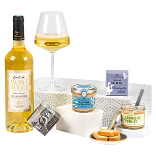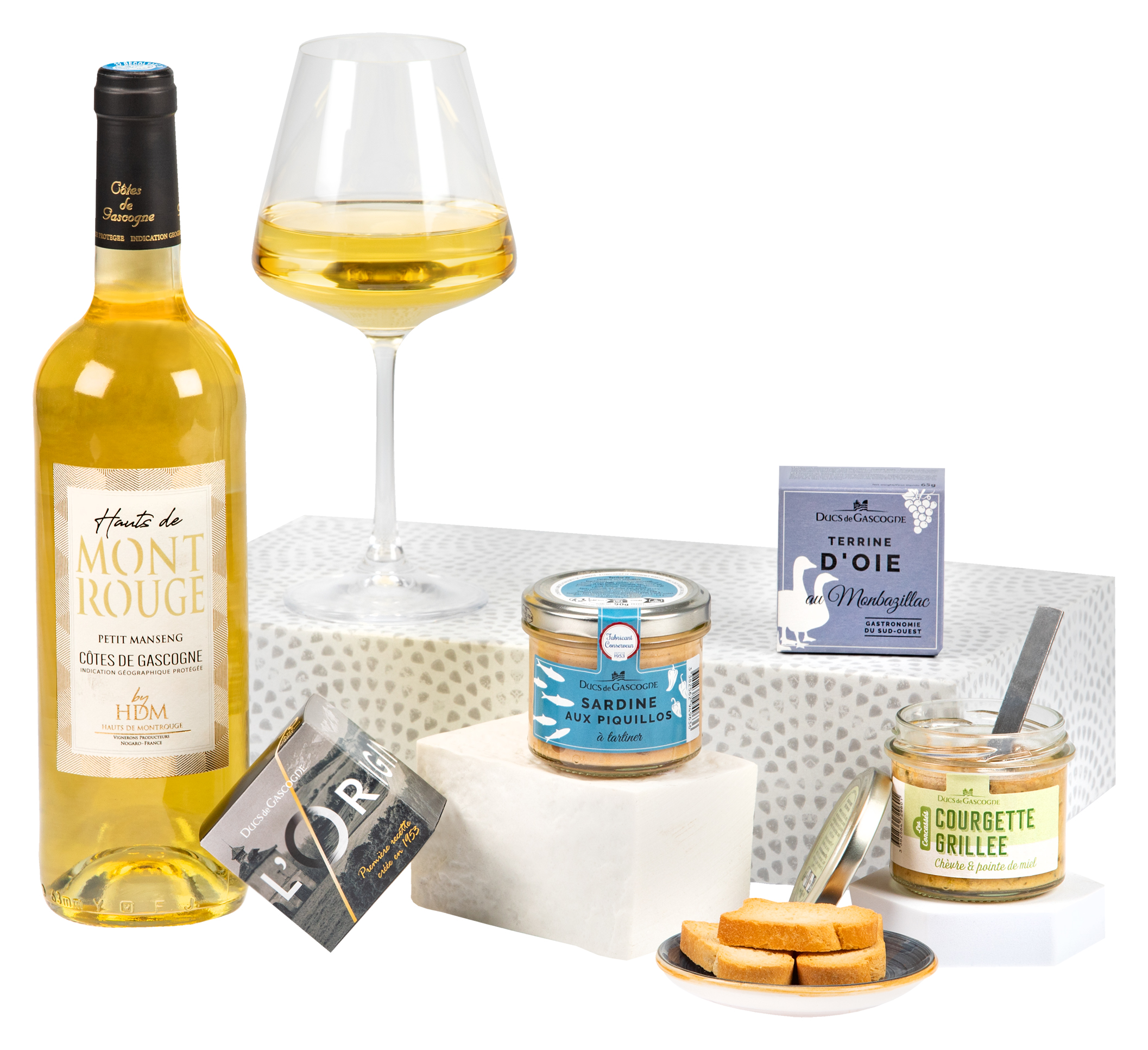 Courgette grillée, chèvre et pointe de miel 90g : Courgette grillée (30%), courgette, oignon, pomme de terre (pomme de terre, conservateur : disulfite de sodium), fromage de chèvre (7%) (Lait de chèvre pasteurisé, sel, ferments lactiques et fongiques, conagulants), eau,miel (3%), sel, poivre""L'originelle"" terrine pur porc 65g : Porc 87,6% : Gorge de porc origine UE, foie de porc, gras de porc, couenne de porc, carotte, oignon, sel, épicesTerrine d'oie au Monbazillac 65g : Viande d'oie origine UE (29%), gras de porc, foie de poulet, foie de porc, œuf, vin blanc, sel, Monbazillac (1%), épicesSardine aux piquillos à tartiner 90g : Sardine (38%), Crème fraiche (lait), pomme de terre, poivron piquillos (9.5%) (poivron piquillos, eau, sucre, sel, acidifiant : acide citrique, affermissant : chlorure de calcium), sel, pulpe d'ailLes hauts de Montrouge IGP Côtes de Gascogne blanc moelleux 75cl : Gros maseng