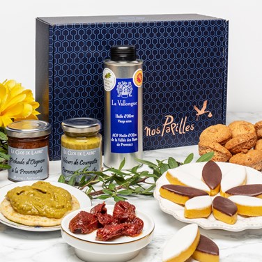 Pétales de tomates séchées au basilic et à l'origanHuile AOP Bio des Baux-de-ProvencePichade d'oignons à la niçoise Délice d'artichaut au thymMacarons amande et citron de Menton Calissons aux amandes de Provence et chocolat