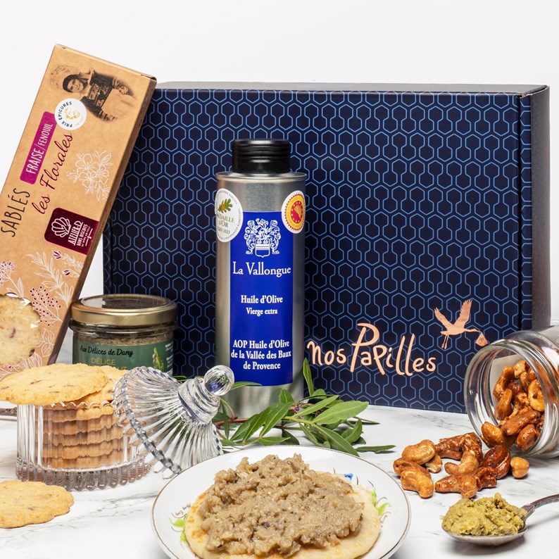 Huile AOP Bio des Baux-de-Provence Caviar d'artichauts aux truffesDélice de petits pois, cajou, mentheNoix de cajou aux cèpesSablés fraise, fenouil