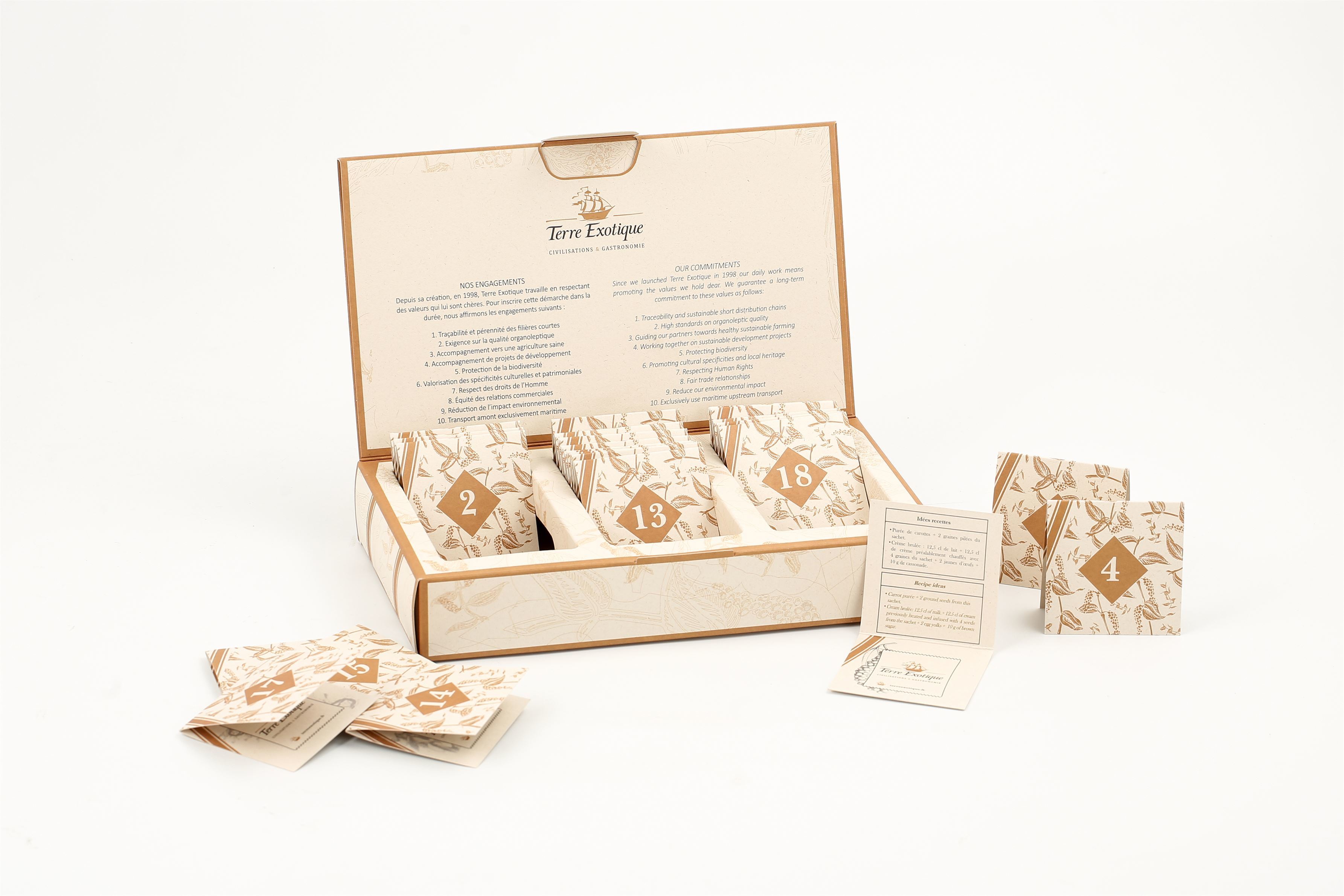 Les épices à deécouvrir : Mélange du Trappeur, Poivre Cubèbe, Assemblage vin chaud, Baie Ma Khaen, Baie Timur, Assemblage pour spéculoos, Cardamome verte, Poivre Voatsiperifery, Sucre roux à la fève tonka, Zathar, Sumac, Sel Viking, Assemblage pain d'épices, Assemblage Arrabiata, Poivre blanc de Penja IGP, Chaï Classic : , Gomasio, SESAME à la prune ume, Schichimi Togarashi, Assemblage pour court-bouillon, Assemblage cajun, Diamant de sel à la truffe d'été, aromatisé, Assemblaqge steackhouse, Assemblage pour foie gras, Poivre à huître.