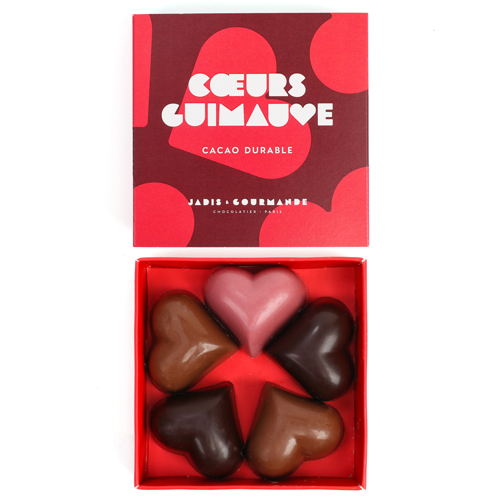 Boîte 5 coeurs en guimauve assortiment chocolat au lait noir chocolat ruby 43g