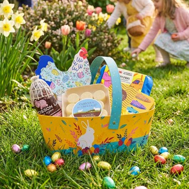 - Le tout présenté dans un joli panier en carton décoré qui sera parfait pour la chasse aux oeufs