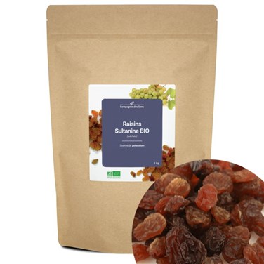 Ces Raisins Sultanine séchés sont certifiés BIO par Ecocert (FR-BIO-01). Source de potassium , ils peuvent être consommés natures en en-cas ou mélangés avec d'autres fruits secs, dans des desserts, mueslis, laitages ou encore dans des préparations aussi bien sucrées que salées. Ces Raisins Sultanine sont vendus dans un sachet hermétique pour préserver tous leurs bienfaits et les utiliser facilement au quotidien.