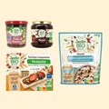 Pâte à tartiner chocolat noir 350g, Confiture extra Rhubarbe Fraise 320g, Tartines craquantes Noisette 150g, Muesli sans sucres ajoutés aux graines gourmandes 375g, certifiés par Ecocert n° 17/34529/1302986 et 17/34529/1179219